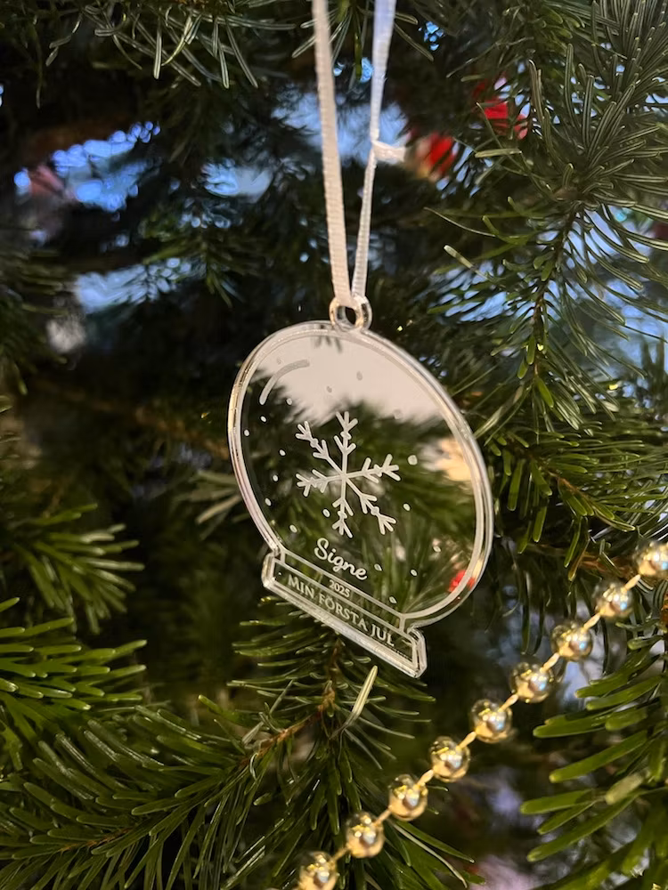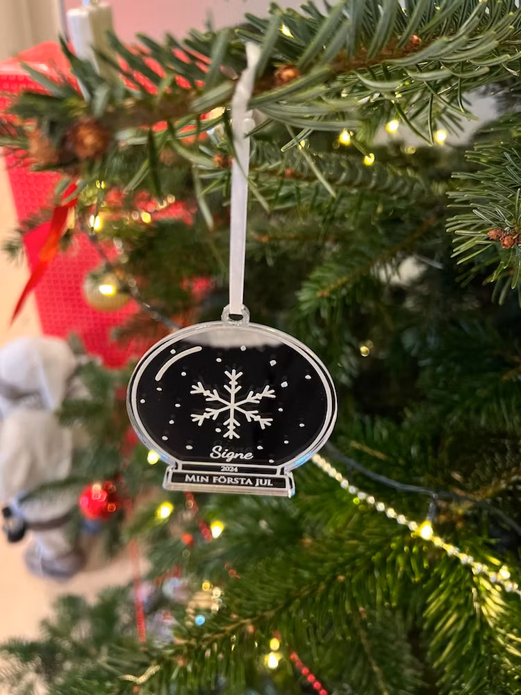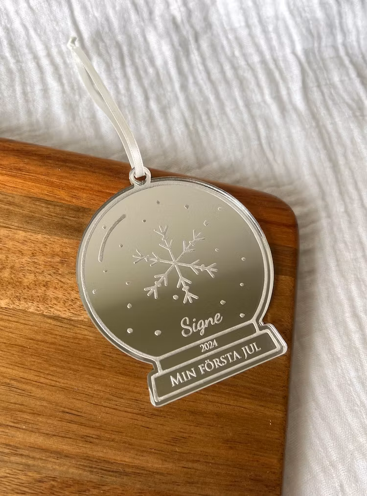 En vacker julgransdekoration i spegelakryl i form av en snöglob för att minnas bebisens första jul. Välj mellan guld och silver.